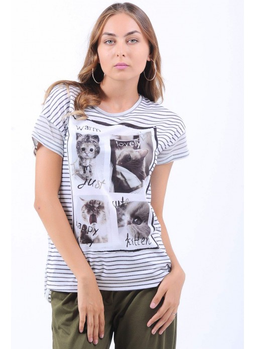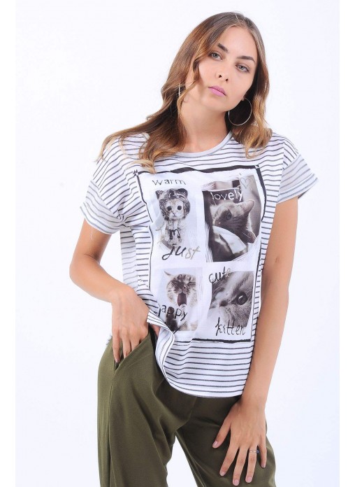 Cat Baskılı Çizgili Beyaz T-Shirt