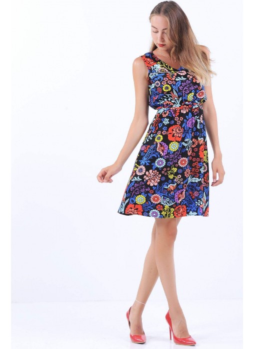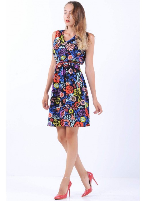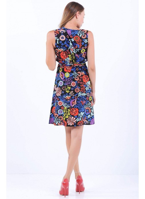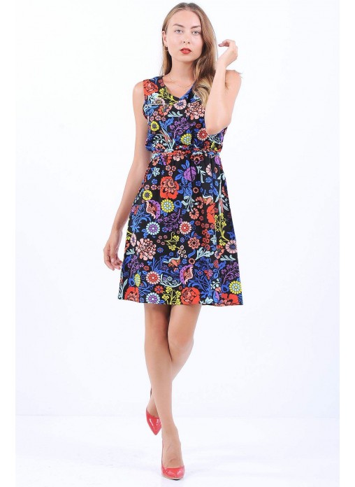 Çiçek Desenli Fermuar Detay Siyah Elbise
