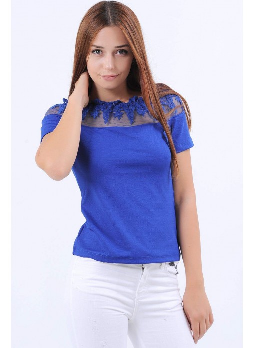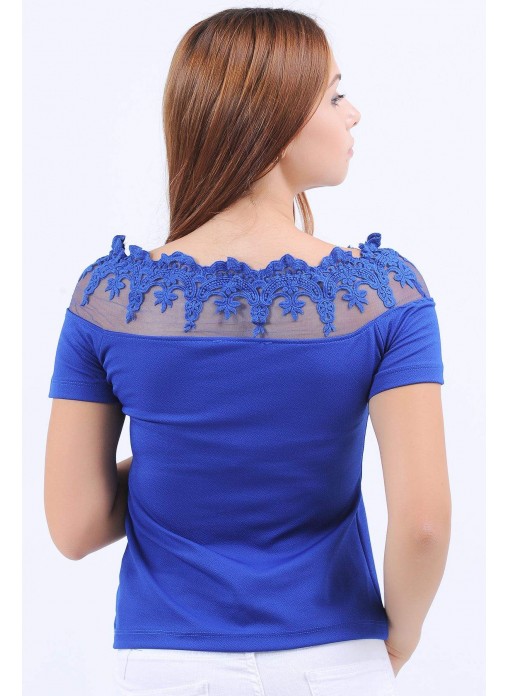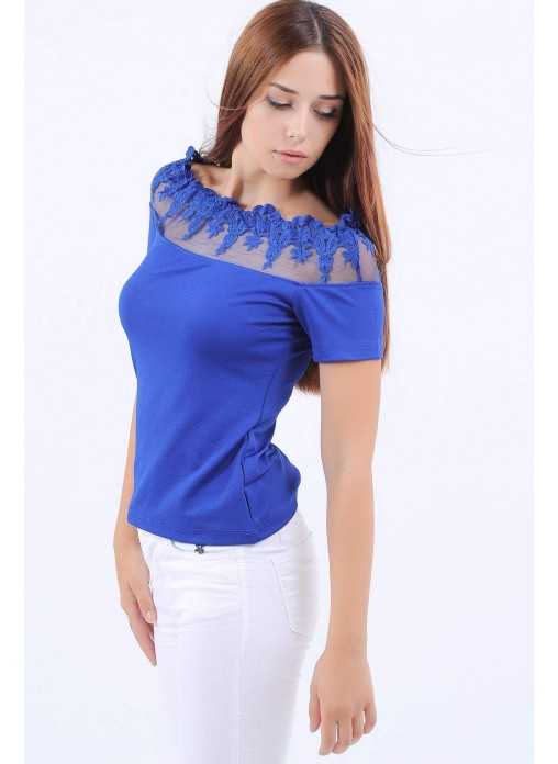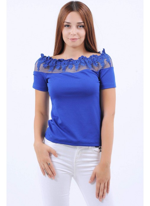 Dantel Kayık Yaka Saks Mavisi Bluz