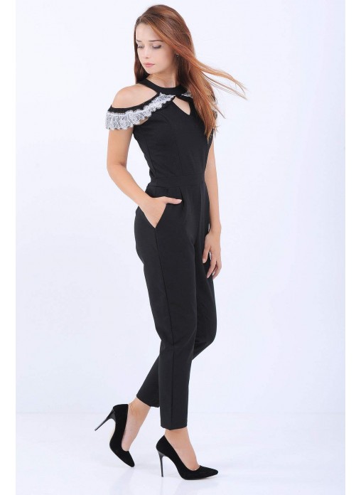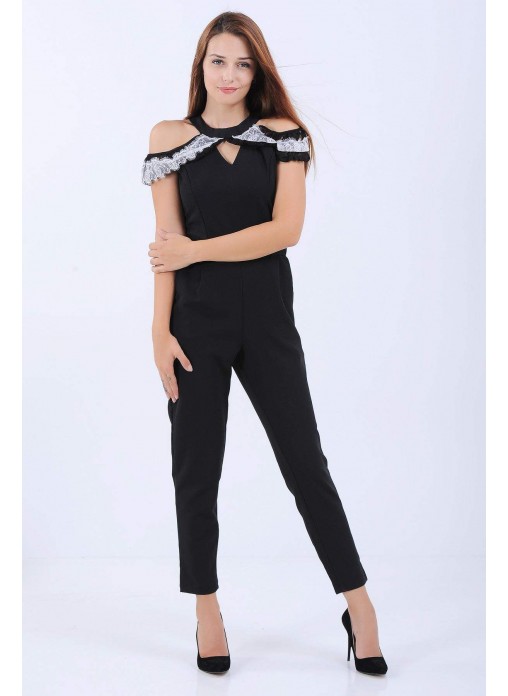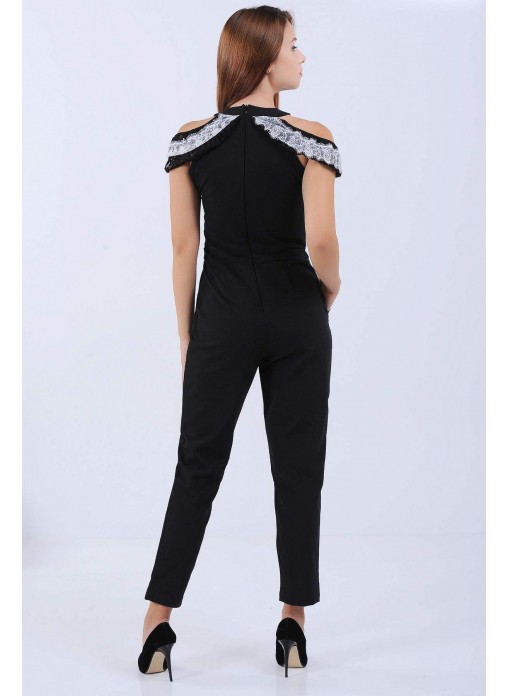 Dantel Omuz Beyaz Detay Siyah Tulum