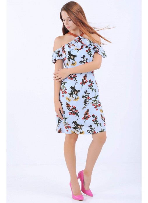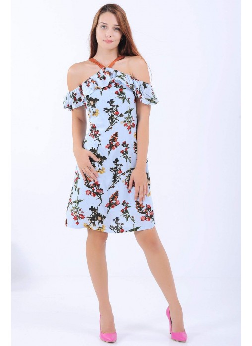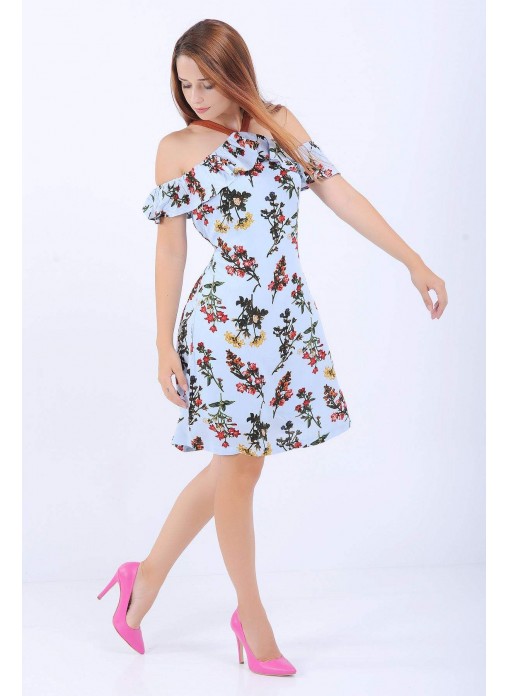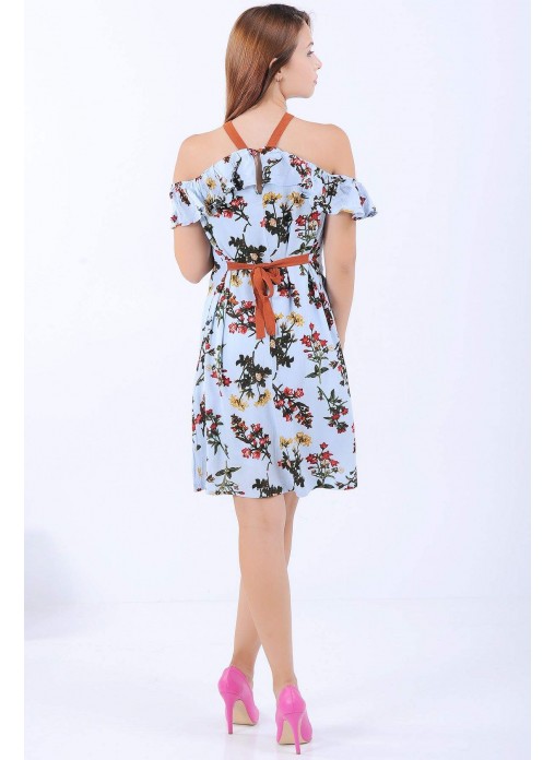 Halka Yaka Çiçek Desen Açık Mavi Elbise
