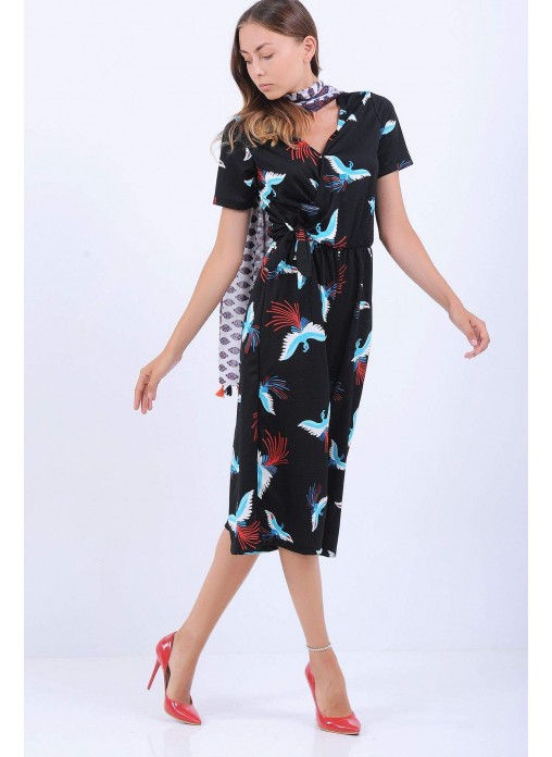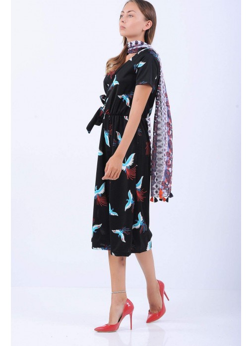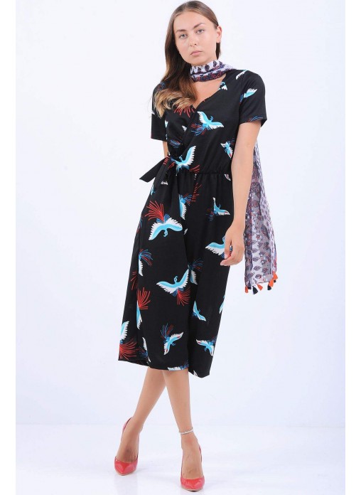 Mavi Kuş Desen Çapraz Yaka Siyah Tulum