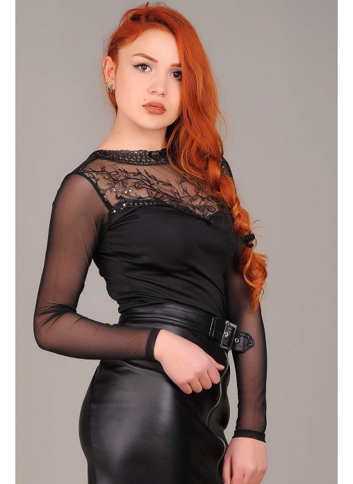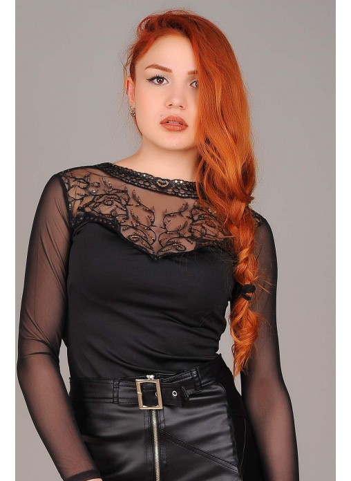 Tül Detay Siyah Bluz