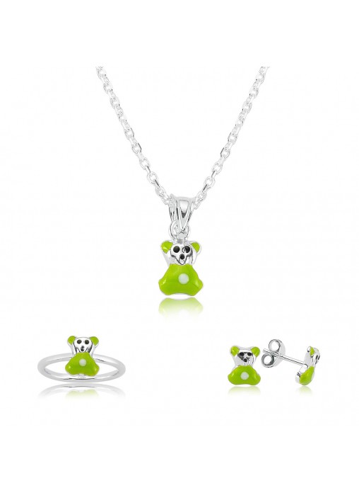 Gümüş Yeşil Ayıcık Çocuk Set Gümüş yeşil ayıcık çocuk seti ile çocuklarınız sevindirebilirsiniz. Küpe Uzunluğu :1x1 cm Kolye Uzunluğu :1x1.5cm Yüzük :1x1 cm Zincir Uzunluğu Ortalama 40 cm'dir. Ürün kadife hediye kutusunda gönderilecektir... Ürünlerimizin tamamı el emeği ile üretilmiştir ve değerli taşlar nedeniyle ürün ağırlığında ± %5 sapma olabilmektedir.