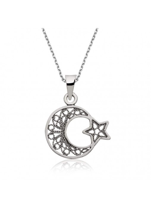 Gümüş Ay Yıldız Kolye Türk Bayrağının rengini şehitlerin kanından ilhamını da kan gölüne yansıyan ay ve yıldızdan aldığını biliyoruz. Bayrağın taşıdığı kutsal anlamı teninizde taşımak ve sevdiklerinizle paylaşmak için kaçırılmayacak bir fırsat... En : 1.90 cm Boy : 1.60 cm Ağırlık : 2.20 gr Ürün hediye kutusunda gönderilecektir... Ürünlerimizin tamamı el emeği ile üretilmiştir ve değerli taşlar nedeniyle ürün ağırlığında ± %5 sapma olabilmektedir.