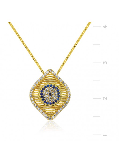 Gümüş Zirkon Taşlı Altın Kaplama Nazarlı Kolye Gümüş altın kaplama nazar kolye severek kullanabileceğiniz ve sevdiklerinize hediye edebileceğiniz bir aksesuardır. Ağırlık: 2.8 gr Ürün hediye kutusunda gönderilecektir... Ürünlerimizin tamamı el emeği ile üretilmiştir. Gümüş ve değerli taşlar nedeniyle ürün ağırlığında ± %5 sapma olabilmektedir.