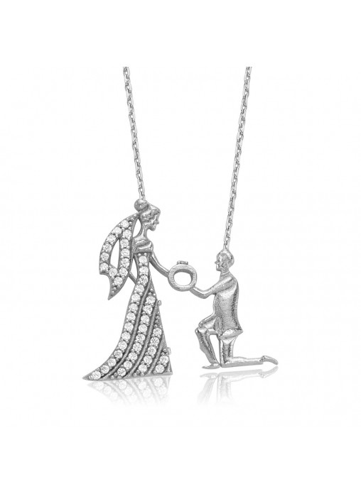 Gümüş Evlilik Teklifi Kolye En romantik anlarınıza eşlik edecek, sevdiğinize karşı duyduğunuz hislerinizi dile getirecek evlilik teklifi kolye mutlu aşıkları bekliyor. En : 2 cm Boy : 2.3 cm Ağırlık : 2.5 gr Ürün hediye kutusunda gönderilecektir... Ürünlerimizin tamamı el emeği ile üretilmiştir. Gümüş ve değerli taşlar nedeniyle ürün ağırlığında ± %5 sapma olabilmektedir.