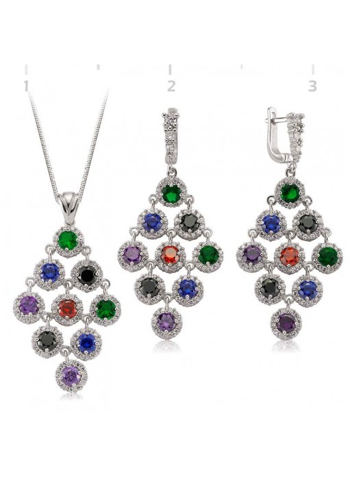 Gümüş Renkli Zirkon Taş Set Gümüş ve rengarenk zirkon ışıltısı ile göz kamaştırın. İçi içine sığmayan, modern romantik bayanlar için günümüz modası farklı stillerde yeniden yorumlanıyor. Zirkonun göz alıcı parıltısı ile güzelliğinize zarif ve büyüleyici dokunuşlar... Sizin olduğu kadar sevdiklerinizin de keyifle takacağı bu set, aynı zamanda sevginizi paylaşabileceğiniz en güzel hediyelerden biri olacaktır. Küpe Uzunluğu :2.8x2.6 cm Kolye Uzunluğu :2.8x5 cm Zincir Uzunluğu Ortalama 45 cm'dir. Ürün kadife hediye kutusunda gönderilecektir... Ürünlerimizin tamamı el emeği ile üretilmiştir. ve değerli taşlar nedeniyle ürün ağırlığında ± %5 sapma olabilmektedir.