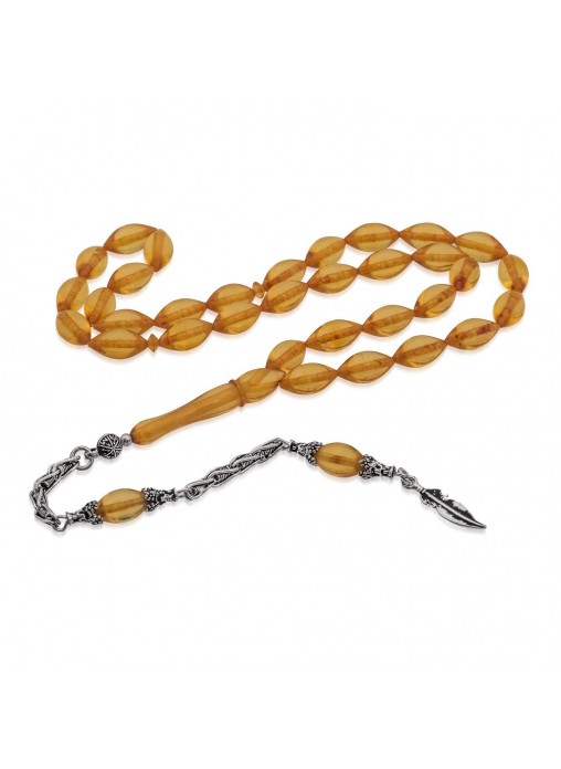 Gümüş Püskül Ateş Kehribar Tesbih Kehribar bir taş olarak anılır ve ağaçların korunma mekanizmaları arasında yer alan reçinelerin fosilleşmiş halidir. Yapılan incelemeler neticesinde kehribarın içerisinde fosilleşmiş canlılara da rastlanmıştır. Şifalı taş olarak kabul edilen kehribarın bileşiğinde, oksijen, hidrojen, karbon ve de süksinik asit bulunmaktadır. Kehribar yapı itibariyle incelendiğinde, bu taşın aşırı derecede saydam olması dikkat çeken ilk özelliktir. Sahip olduğu ultra yumuşaklık ve hafiflik, kehribarın özelliklerinden bazılarıdır. Kehribarlar, oluşum itibariyle iki renkte bulunmaktadır. Bunlardan ilki sarı renktir. Fakat bu sarı tam renginde değil, kırmızımsı sarı şeklinde kendini gösterir. Yeşil renkli kehribarlar renklendirilmiştir.Diğer kehriban rengi ise, donuk sarı renge sahip kehribardır. Bu tür kehribarın diğer bir adı ise eskitilmiş kehribardır. Kehribar taşı, etkileri nedeniyle şifalı taş olarak sayılmaktadır. İnsan sağlığına olan etkilerinden dolayı şifalı olarak nitelendirilmekte olan kehribar taşının vücuda birçok olumlu yönde etkisi bulunmaktadır. Astım, bronşit gibi solunum yolları hastalıklarını önler. Ağrı bulunan yerlere sürüldüğünde ağrıyı azaltır. Özellikle romatizmal ağrılarda etkilidir. Psikolojik takıntılara karşı iyi gelir. Sindirim sisteminin özellikle bağırsakların düzenli çalışmasını sağlar. Ruhsal sağlığı korur, melankolik ruh halini önler, ortamdaki olumsuz havayı emerek yok eder, negatif enerjiyi pozitif enerjiye çevirir ve rahatlama hissi verir. En : 0.80 cm Boy : 1.00 cm Ağırlık : 14.10 gr Ürün Uzunluğu : 35.00 cm Ürün hediye kutusunda gönderilecektir... Ürünlerimizin tamamı el emeği ile üretilmiştir ve değerli taşlar nedeniyle ürün ağırlığında ± %5 sapma olabilmektedir.