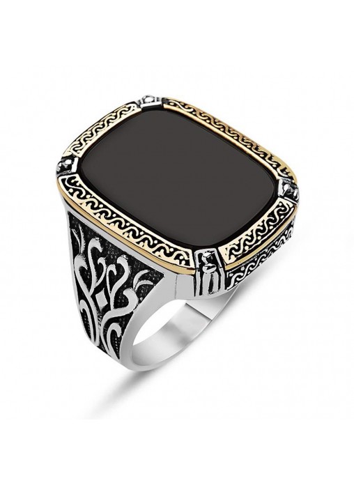 Oniks Taşlı Desenli Gümüş Erkek Yüzük
