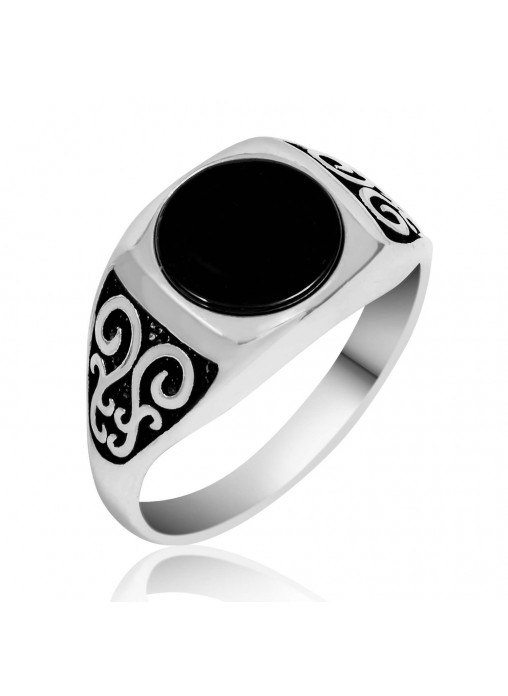 Gümüş Oniks Taşlı Desenli Erkek Yüzük
