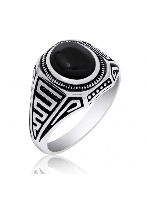 Gümüş Oniks Taşlı Grek Desenli Erkek Yüzük