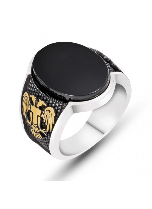 Gümüş Oniks Taşlı Çift Başlı Kartal Armalı Erkek Yüzük