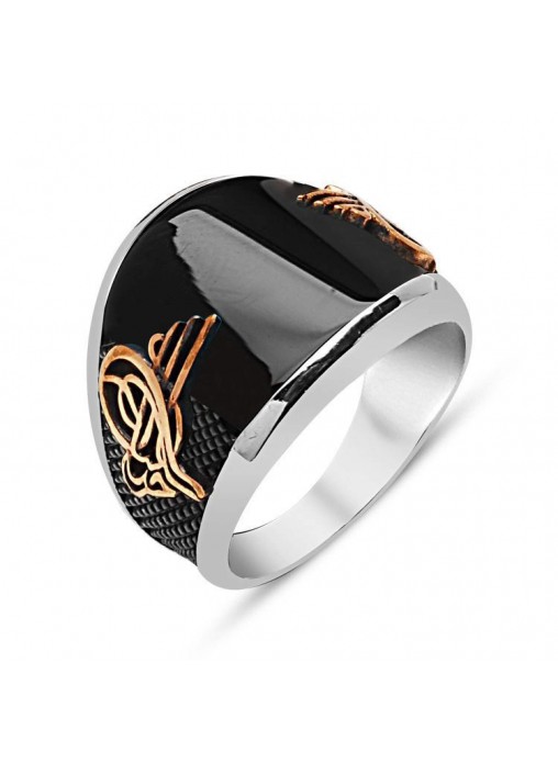Gümüş Oniks Taşlı Tuğra Armalı Yüzük