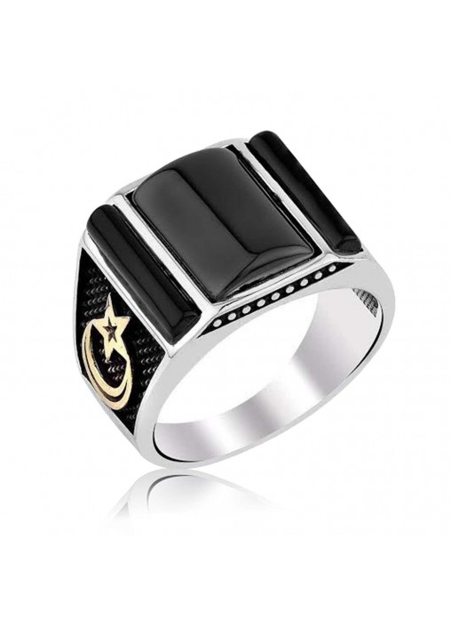 Gümüş Oniks Taşlı Ay Yıldız Armalı Yüzük