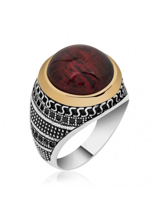 Gümüş Hareli Sıkma Kehribar Erkek Yüzük