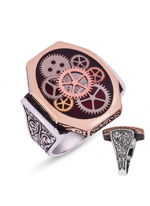 Bordo Mineli Gümüş Saat Çarkı Erkek Yüzük