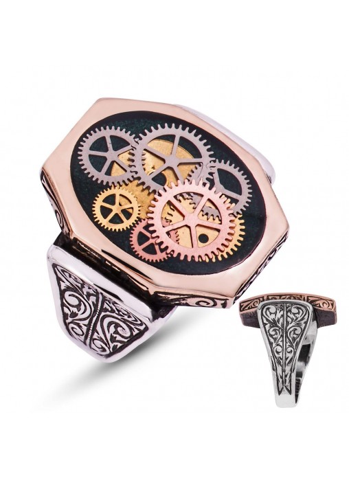 Yeşil Mineli Gümüş Saat Çarkı Erkek Yüzük Bu yüzük dişli çarklar, pinyon dişliler, zemberek, eşapman, denge ağırlığı, kadran gibi mekanik saat parçaları rastgele kullanılarak eşsiz bir desen meydana getirilmiştir. Bir saatin içinde bulunan tüm parçalar bu yüzükte mevcuttur. Bu sayede sevdiğinizi beklerken zamanın ne kadar yavaş geçtiğini, onunlayken de zamanın ne kadar hızlı aktığını anımsatacak. Ayrıca zaman herkesin içinde başka türlü ilerler, günün her anının ne kadar değerli olduğunu saat çarklarından oluşan bu yüzükle hatırlayın. Not: Yüzükte bulunan parçalar her biri birbirinden farklı rastgele parçalardan oluşmaktadır. Yüzük kasası ve zemin rengi fotoğrafta göründüğü gibi olacaktır ancak içindeki parçalar farklı olarak dizilmiş olabilir. Vereceğiniz siparişte lütfen bunu da göz önünde bulundurunuz. En : 2 cm Boy : 2.5 cm Ağırlık : 20 gr Ürün hediye kutusunda gönderilecektir... Ürünlerimizin tamamı el emeği ile üretilmiştir. Gümüş ve değerli taşlar nedeniyle ürün ağırlığında ± %5 sapma olabilmektedir.