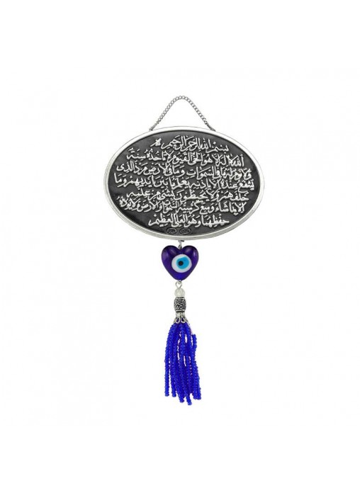 Ayet-El Kürsi yazılı nazar boncuklu, püsküllü gümüş ayet ile duvarlarınızı süsleyin. Hediye etmek sevdiklerinizi sevindrimek için özel bir seçim. Ürünlerimizin tamamı el emeği ile üretilmiştir ve değerli taşlar nedeniyle ürün ağırlığında ± %5 sapma olabilmektedir